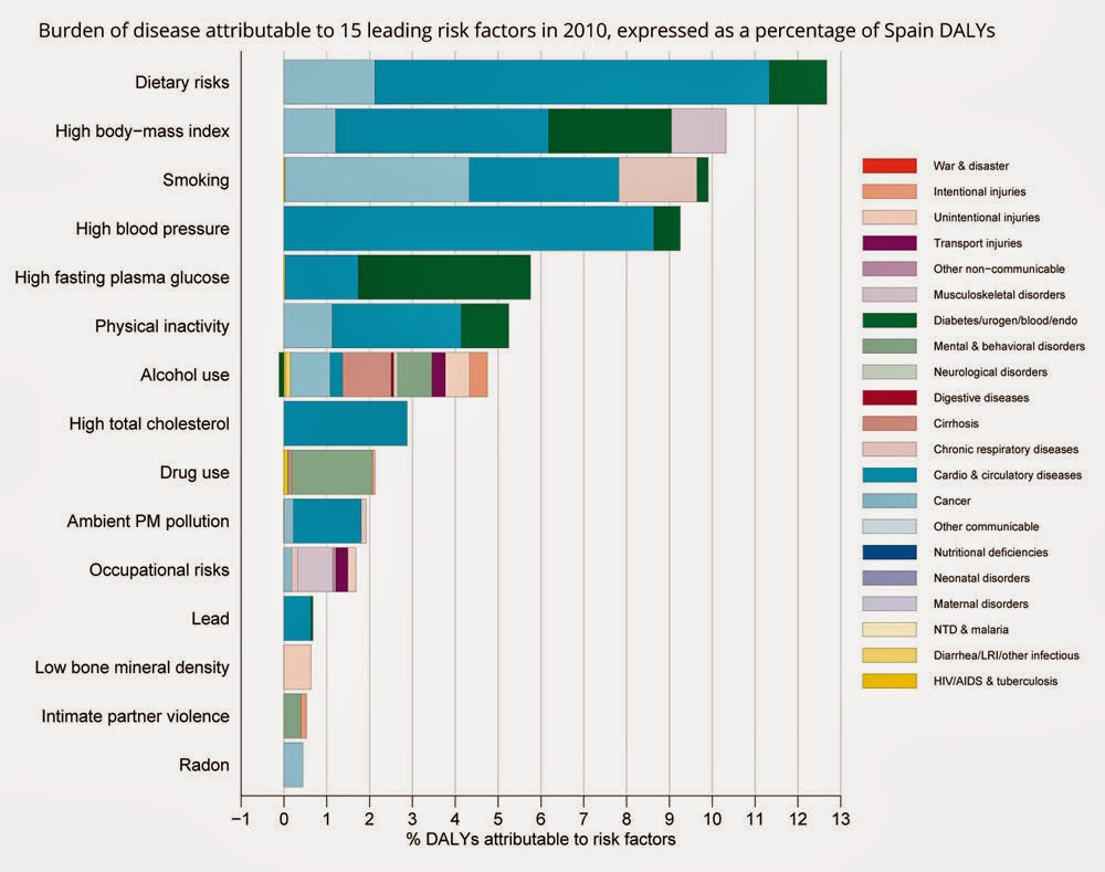 Se trata de una lista en orden decreciente de los principales factores de años potenciales de vida perdidos ajustados por discapacidad (es decir, tomando en cuenta no sólo la mortalidad prematura, sino lo prematuro de la aparición de enfermedades que causan discapacidad) en España en 2010. Como vemos, el factor individual más relevante es el tabaco (ya que la dieta y la obesidad son multifactoriales), y su eliminación o reducción sustancial supondría un avance en años de vida sin discapacidad recuperados equivalente a los del alcohol, las drogas, la contaminación ambiental y los accidentes laborales JUNTOS.