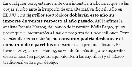 Por eso, para conocer también otros conflictos de intereses de quienes informan (o desinforman) sobre los cigarrillos electrónicos, traigo a continuación un fragmento del blog La acción humana, en el que el autor analiza los conflictos de intereses (mucho dinero hay en juego) respecto al futuro de los cigarrillos electrónicos. No tiene desperdicio. Quien quiera leer el post completo, lo tiene aquí