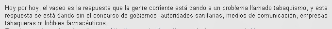 Pero lo importante para el lector que quiere informarse sobre el cigarrillo electrónico no son mis motivos. Lo que debe importarle al lector es que se argumente lo que cada uno dice, y en ese sentido los estudios que apoyan el cigarro electrónico son precisos y sólidos, mientras que las noticias alarmistas, a veces por declaraciones de sanitarios poco informados, suelen ser vagas e imprecisas, del tipo “a lo mejor produce cáncer” o “como lleva nicotina, será igual de dañino que un cigarro normal”.